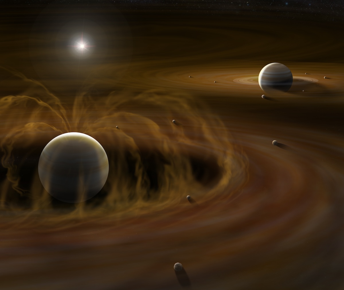 太陽系には、木星と土星のふたつのガス惑星があります。木星には100個以上の衛星がありますが、なかでもイオ、エウロパ、ガニメデ、カリストの4つが他の衛星に比べて抜きん出て質量が大きく、木星の衛星全体質量のほぼ全てを占めています。これら4つは、17世紀にイタリアの科学者ガリレオ・ガリレイによって観測されたことから「ガリレオ衛星」と呼ばれています。一方、土星は280個以上の衛星を持つことが知られていますが、それら全ての質量の95%以上を巨大衛星タイタンが占めています。ガリレオ衛星が木星のすぐ近くの軌道を回っているのに対し、タイタンは土星から少し離れたところを周回しているという特徴の違いがあります。このような巨大衛星の個数やその軌道の違いがどのようにして生じるのかは、よくわかっていません。