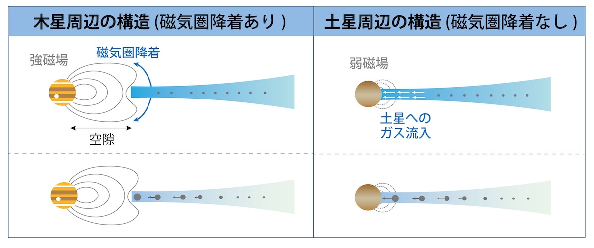 惑星の表面磁場に加え、研究チームはガス円盤構造の詳細な解析と衛星の形成・軌道移動の数値シミュレーションを国立天文台が運用する「計算サーバ」を用いて行いました。ガス円盤の一部が電離されプラズマ化すると、ガスは惑星の磁場に沿って流れます(図2左)。これを「磁気圏降着」と呼びます。磁気圏降着が起きるかどうかは、ガスの流れの勢いと磁場の強度の兼ね合いに依って決まります。十分磁場が強い木星の場合は、この磁気圏降着が起こります。そしてガス円盤内に形成された衛星は、円盤ガスとの相互作用で木星に向かって円盤内部を軌道移動しますが、円盤の内縁で堰き止められます。そのため、円盤の内縁に移動してきた衛星が、衛星同士の重力相互作用で次々と安定した軌道を持つようになり、ガス円盤にとどまります。一方、磁場が弱い土星の場合は、磁場がガスの勢いに負けてしまうため、磁気圏降着が起こりません(図2右)。土星の付近に移動してきた衛星は円盤にとどまることができず、土星に飲み込まれてしまいます。その結果、土星の近くには衛星が生き残らず、外側の軌道で形成されたタイタンだけが生き残ります。