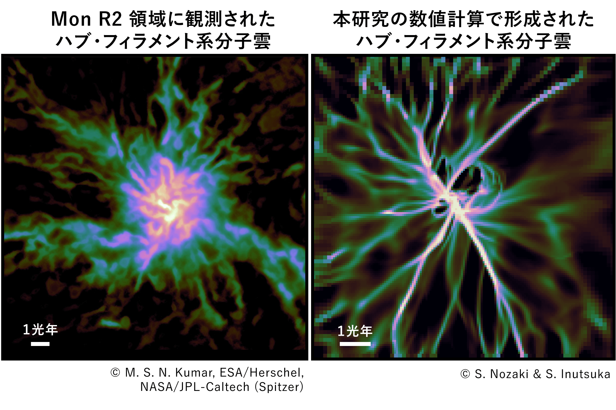 本研究をリードした九州大学大学院理学府 博士課程3年の野﨑信吾さんは、「今回の研究では、観測で⾒えている特徴的なガス構造が、どのような物理過程で作られるのかを⽰すことができました。放射状に並ぶ構造は⼀⾒すると特殊に⾒えますが、衝撃波と磁場の組み合わせによって⾃然に⽣まれることがわかりました。今後は、さまざまな形のハブ・フィラメント系分⼦雲を統⼀的に理解することを⽬指したいです」と、本研究の意義と今後の展望を述べています。