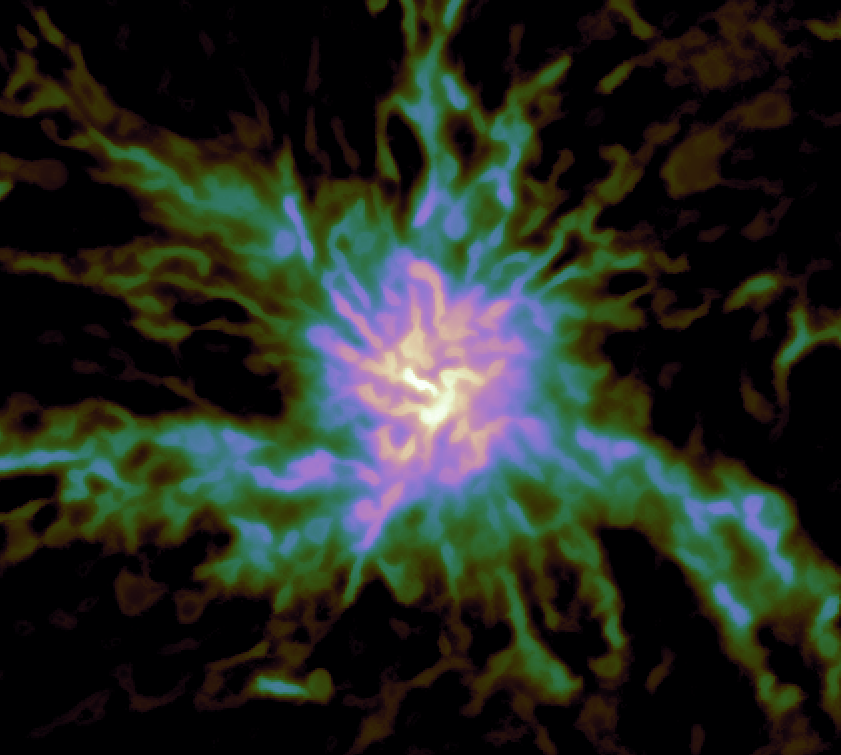 宇宙では、星は分⼦雲*1と呼ばれる低温のガスの集まりの中で⽣まれます。なかでも、⼤質量星や星団が形成される現場として注⽬されているのが、「ハブ・フィラメント系分⼦雲」です。この天体では、複数の細⻑いガス構造が、中⼼の⾼密度領域へ向かって集まっています。しかし、このような放射状に整列したフィラメント状ガス構造が、どのような物理過程によって作られるのかは分かっておらず、その形成機構の解明が求められていました。