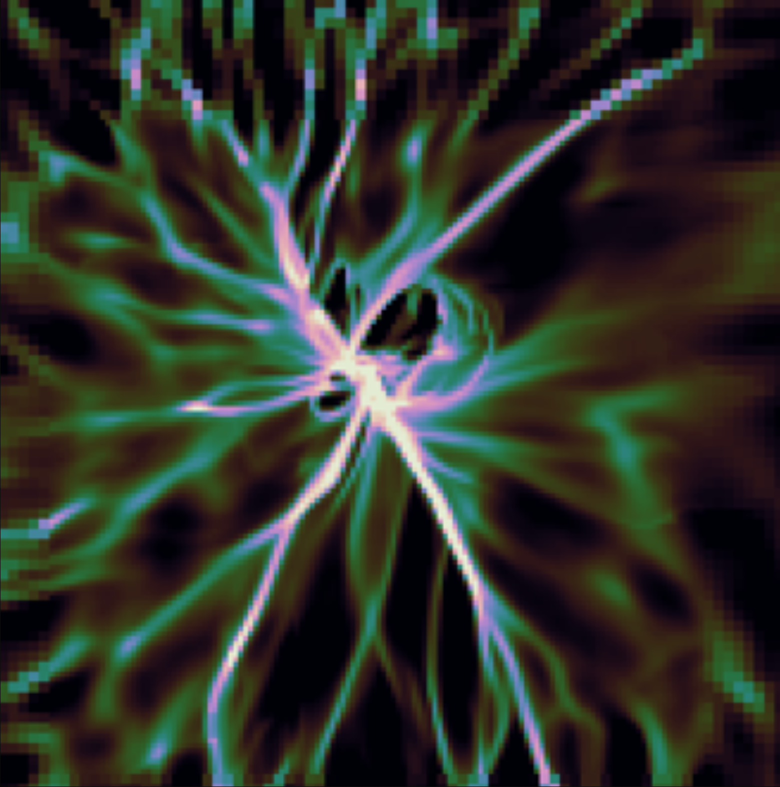 そこで本研究グループは、実際の分⼦雲では磁場が⼀様ではなく、重⼒の影響で中央に向かってくびれた形をしていることに注⽬しました。そして、そのような分⼦雲に⾼速の星間衝撃波がぶつかったときに何が起こるのかを、国⽴天⽂台の天⽂学専⽤スーパーコンピュータ「アテルイⅢ」を⽤いた 3次元磁気流体数値シミュレーションによって詳しく調べました。その結果、衝撃波の通過後に、衝撃波によって掃き集められたガスがくびれた磁場によって流れの向きを変えられ、中⼼⽅向に向かって細い流れに分裂しながら集まることで,放射状のフィラメント構造が形成されることがわかりました(動画,図2)。また、形成されたフィラメントの⻑さや幅は、実際に観測されているハブ・フィラメント系分⼦雲の特徴とよく⼀致していました。