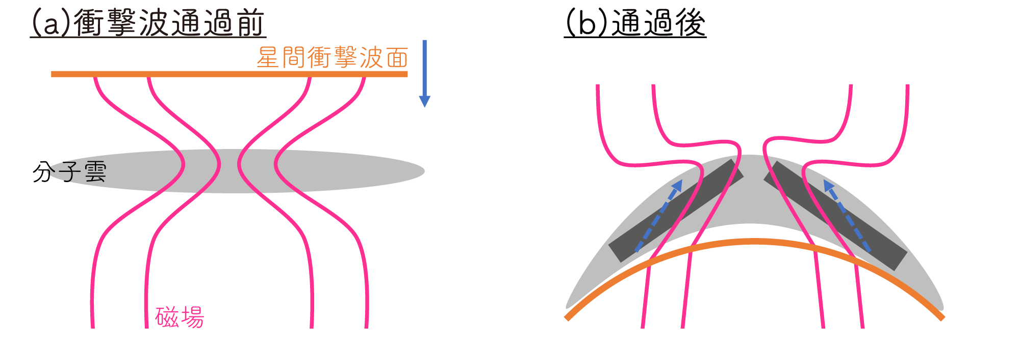 宇宙空間のガスの中を伝わる、強い圧縮の波。⼤きな星のまわりでガスが勢いよく広がるときや、星が⼀⽣の最後に⼤爆発を起こすときなどに⽣じます。通り過ぎるとガスが急激に押し縮められ、密度や流れ⽅が⼤きく変わるため、分⼦雲の形や星形成に影響を与えることがあります。