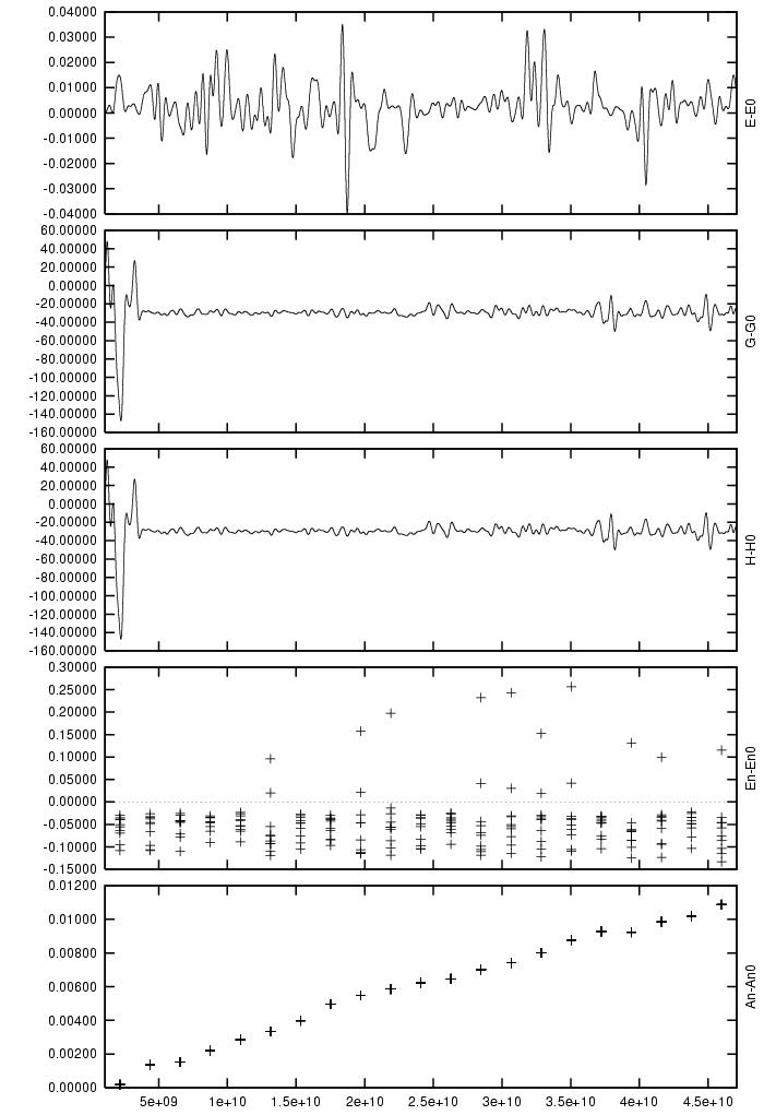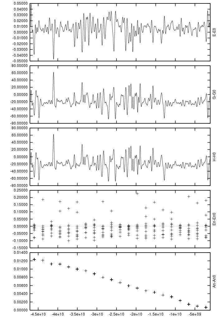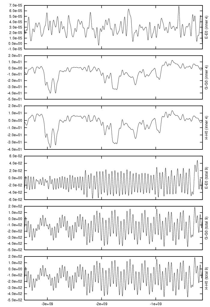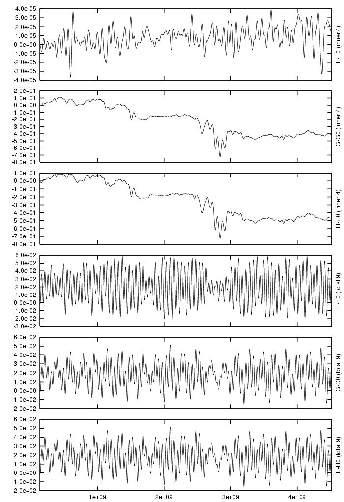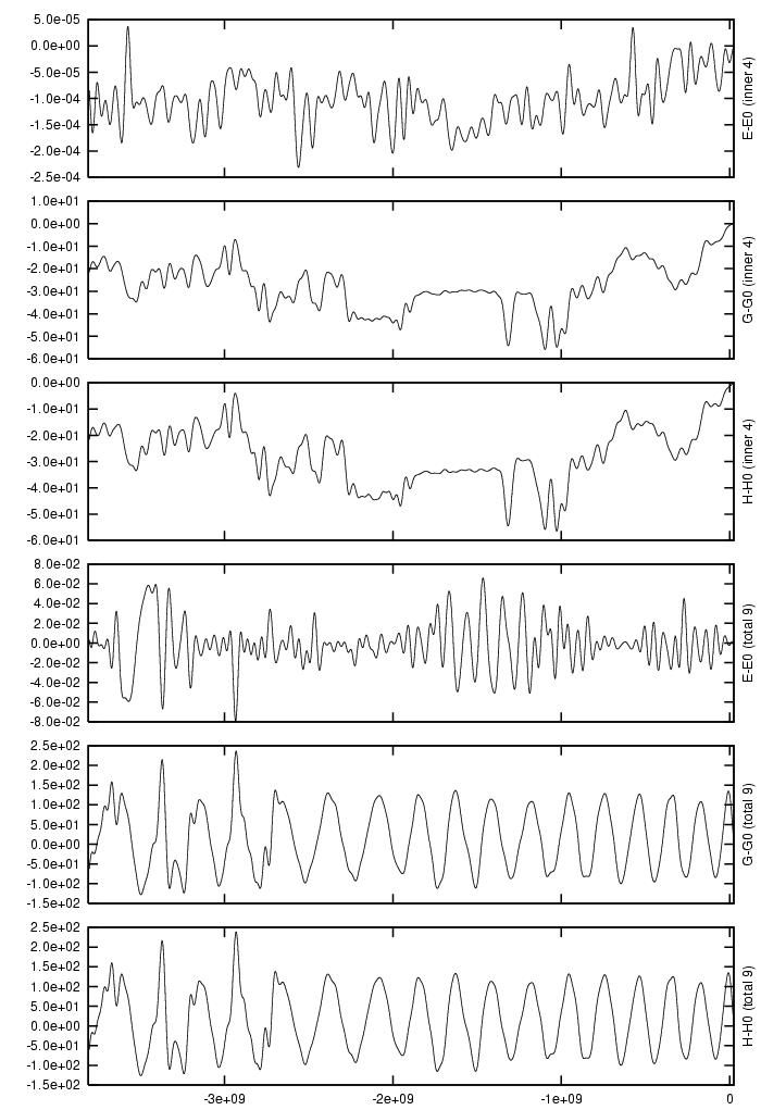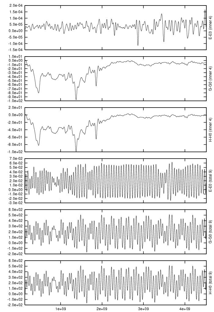 Absolute difference in total energy (E-E_0), angular momentum (G-G_0),